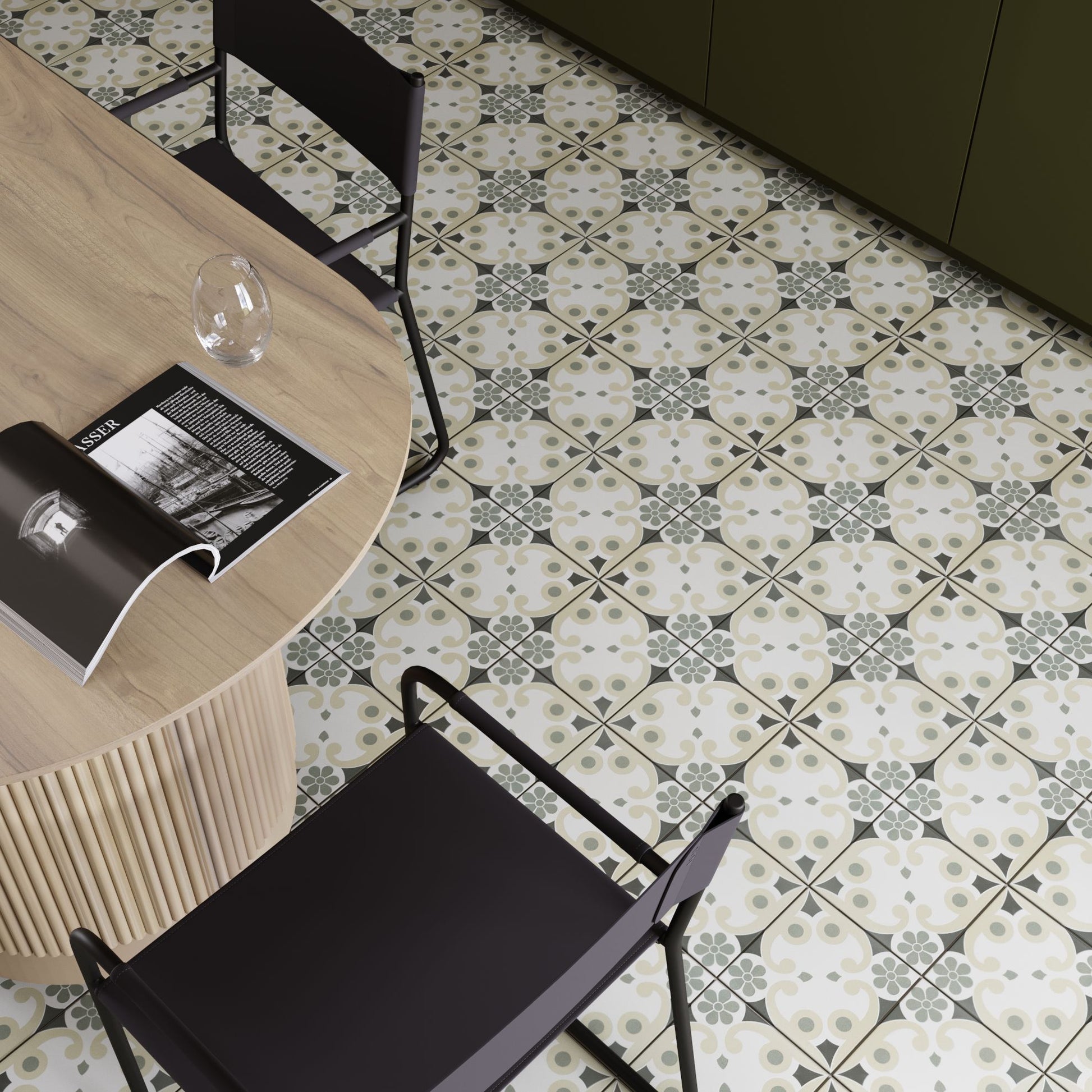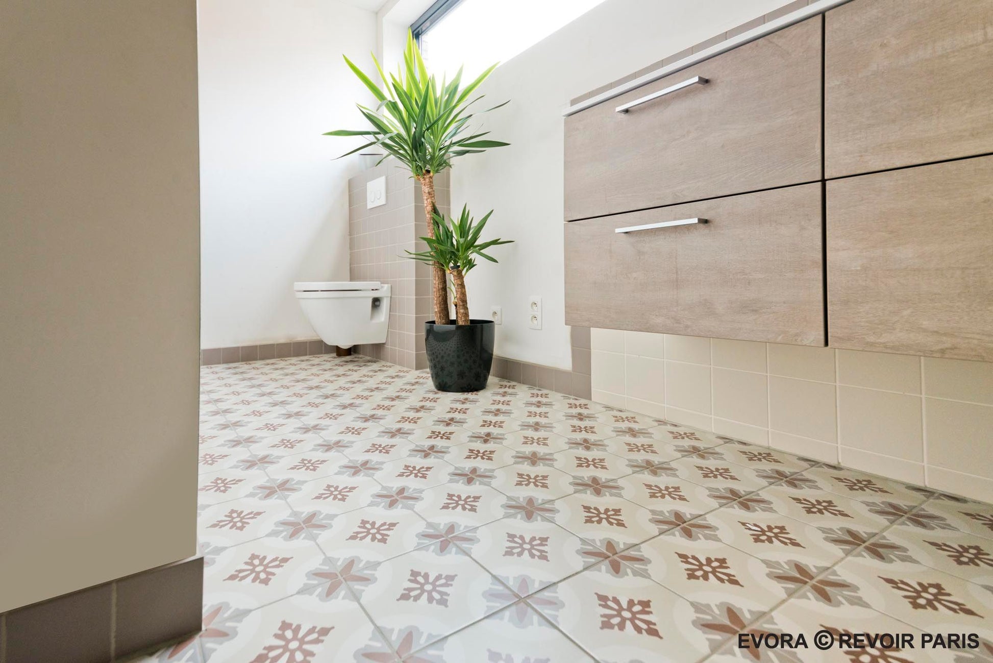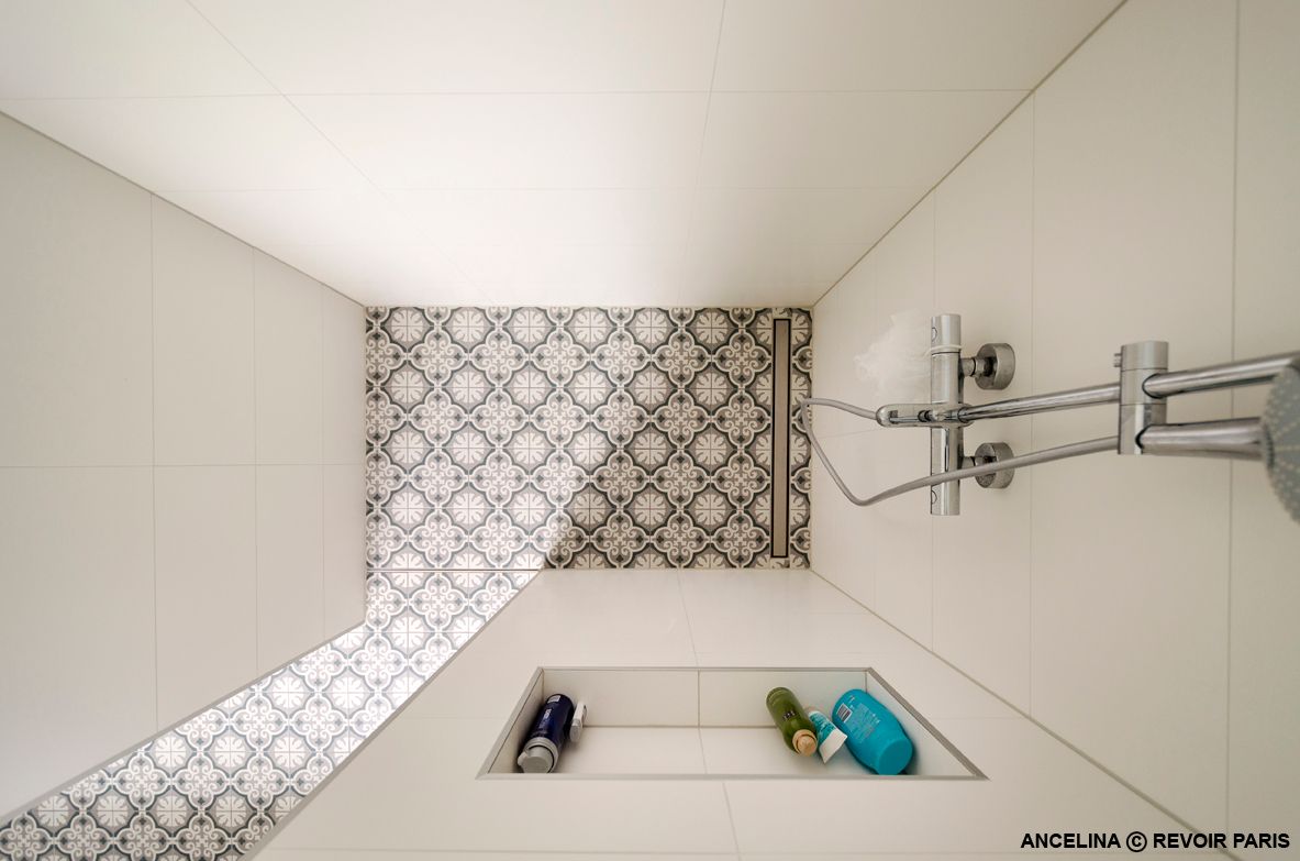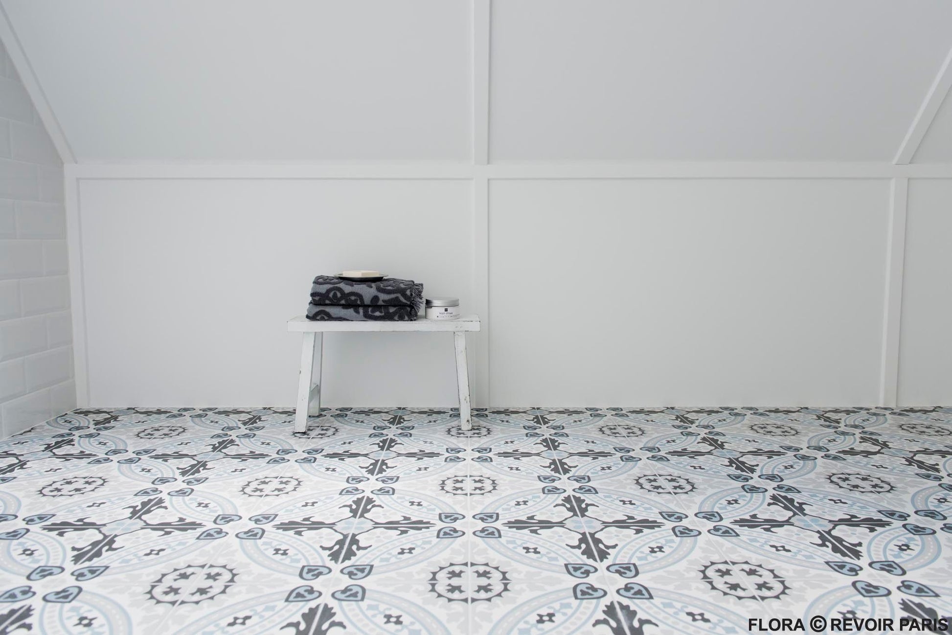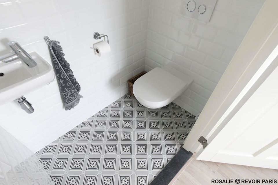 La Madeleine de Revoir Paris se compose de carreaux 20x20 cm avec un rendu volontairement artisanal. Les motifs sont très décoratifs, inspirés à la fois du carrelage ancien et de designs plus contemporains, avec une ambiance rétro chic proche du carreau de ciment.