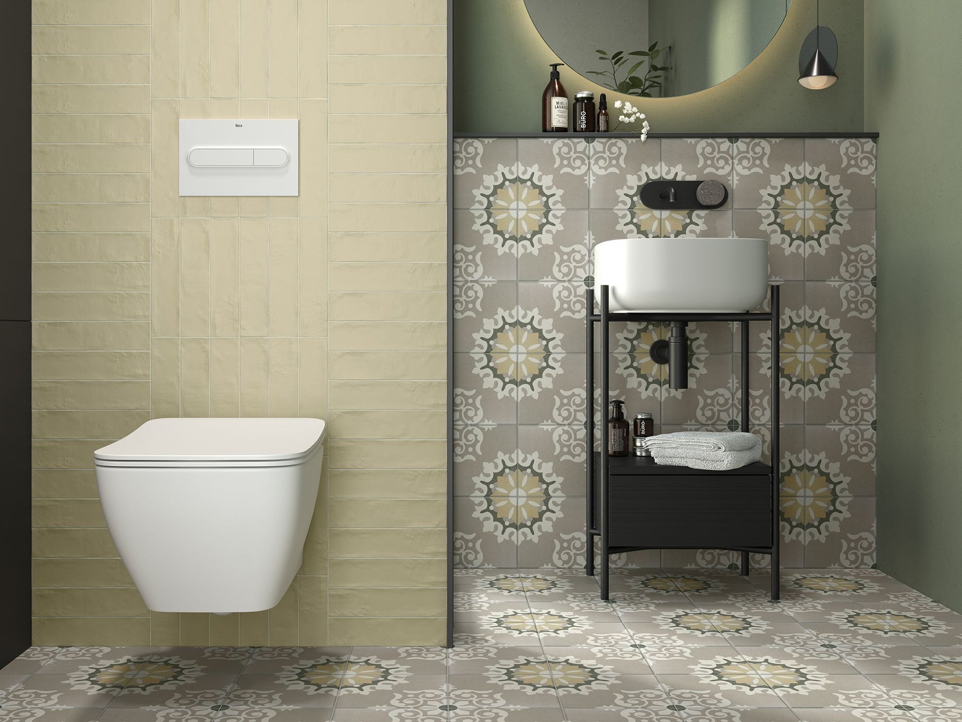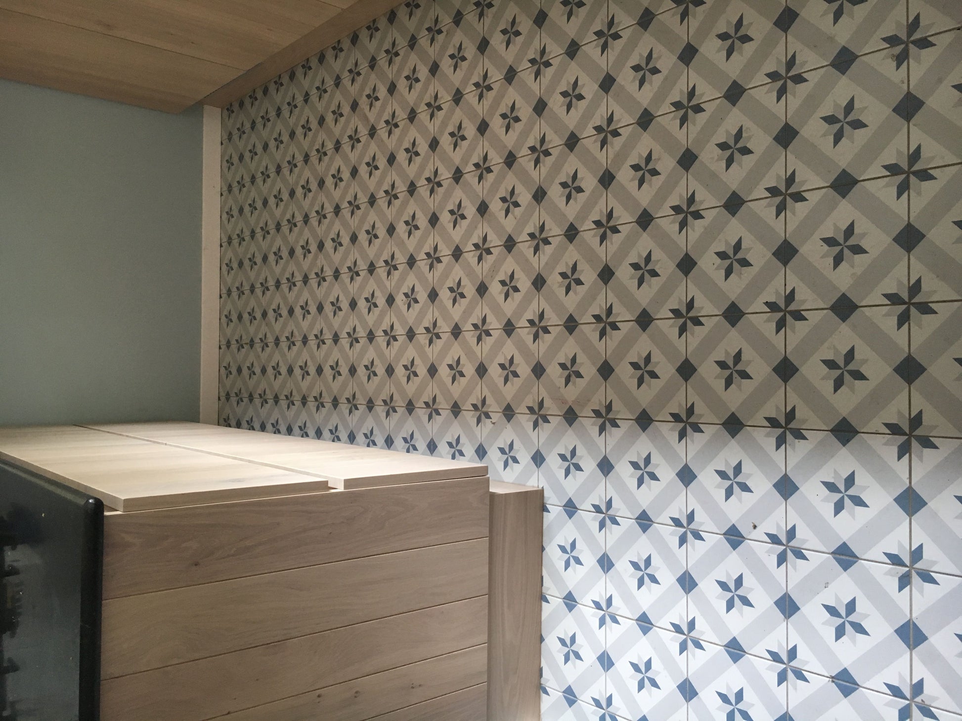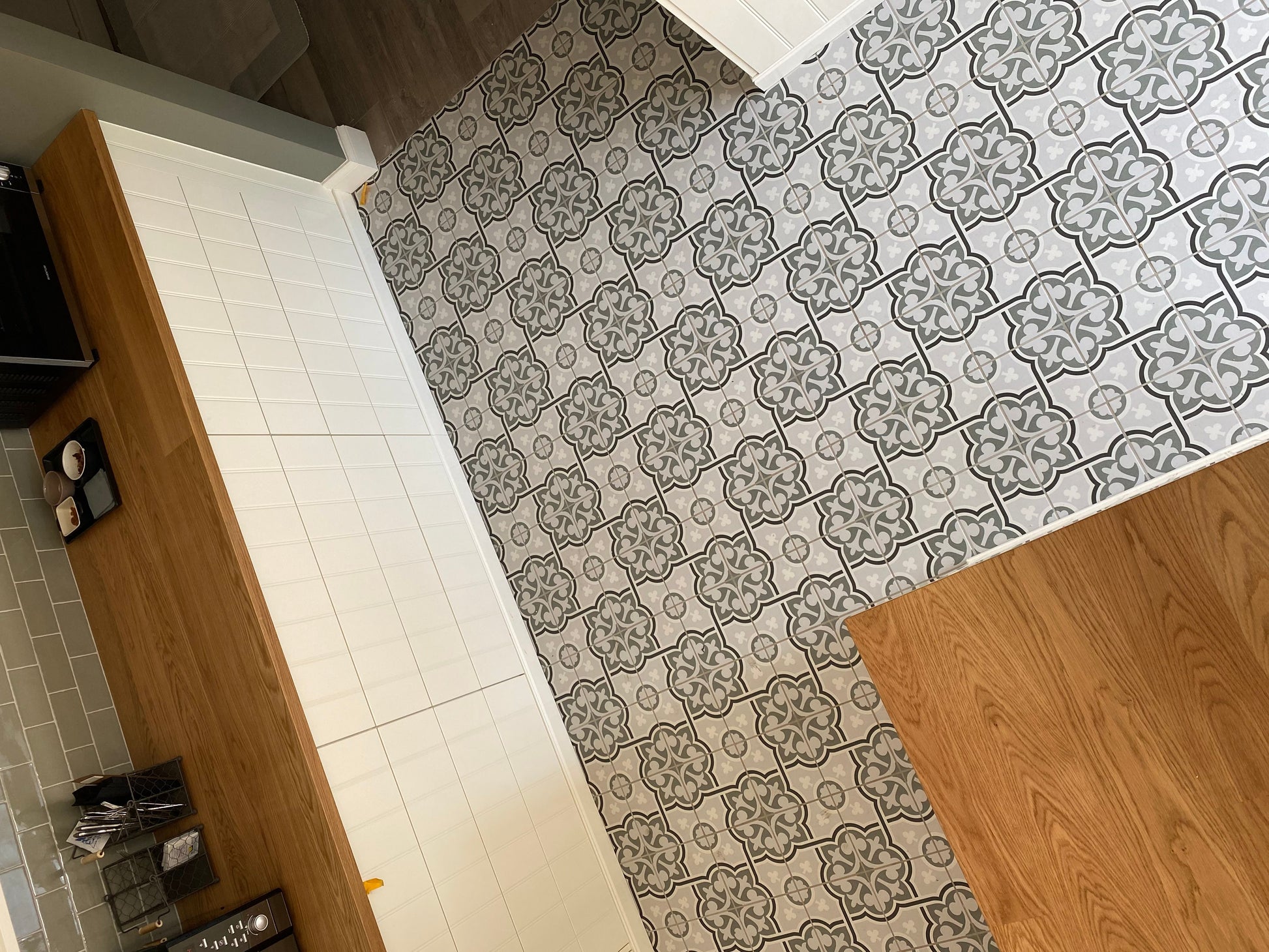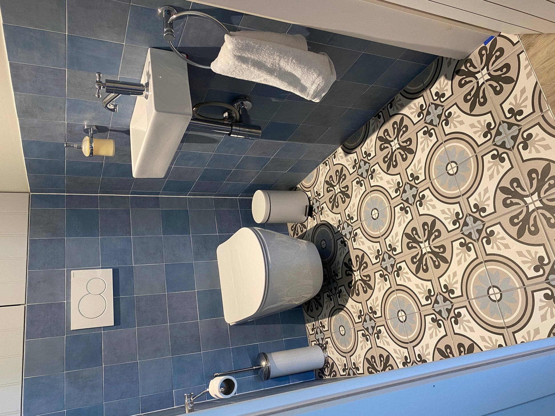 La Madeleine de Revoir Paris se compose de carreaux 20x20 cm avec un rendu volontairement artisanal. Les motifs sont très décoratifs, inspirés à la fois du carrelage ancien et de designs plus contemporains, avec une ambiance rétro chic proche du carreau de ciment.